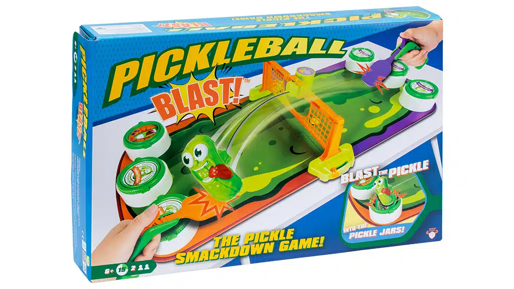 Pickleball Blast porta un nuovo colore nello sport con un campo da tavolo delle dimensioni di un gioco da tavolo e una rete a cui è collegato un lanciatore Screamin Pickle. Con le racchette da pickleball controllate dal pollice, i giocatori lanciano lelemento di gioco Pickle in aria e cercano di rovesciare i coperchi dei pickle dallaltra parte del campo. Questo gioco non è solo divertente, ma sviluppa anche la destrezza manuale e il pensiero strategico. È una scelta ideale per riunioni di famiglia o gruppi di amici che vogliono aggiungere un po di spirito competitivo alla vita quotidiana.