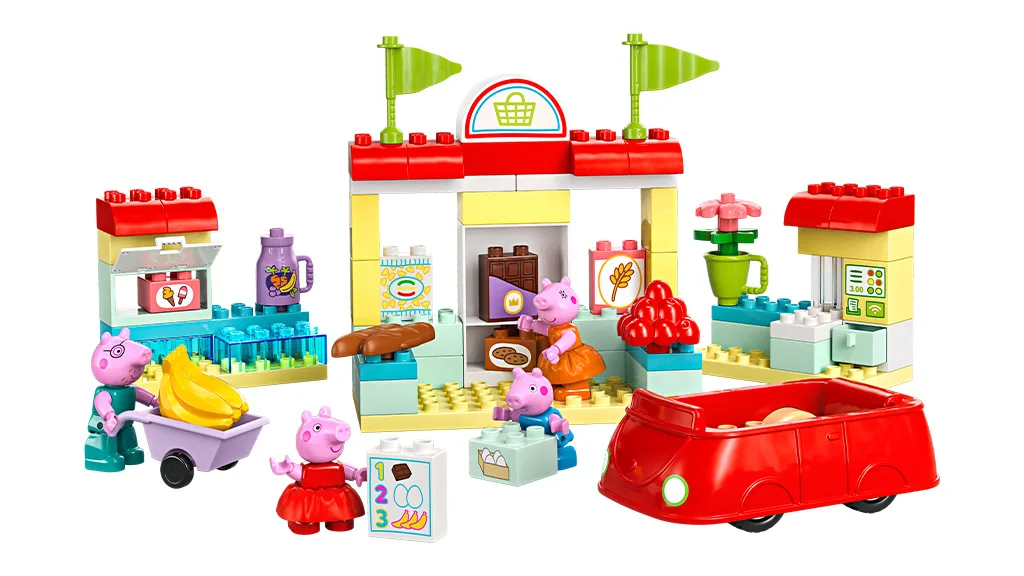 Per un set LEGO ancora più grande, la Casa di Compleanno di Peppa Pig offre 59 pezzi di divertimento a tema compleanno. Il set include Peppa e i suoi amici, Suzy e Pedro, pronti a scartare i regali e spegnere le candeline della torta di compleanno. Il set Peppa Pig Supermercato ha il maggior numero di pezzi tra i pacchetti, con un totale di 63 pezzi. Il set include unauto, un carrello della spesa, una lista della spesa, vari alimenti e molto altro.