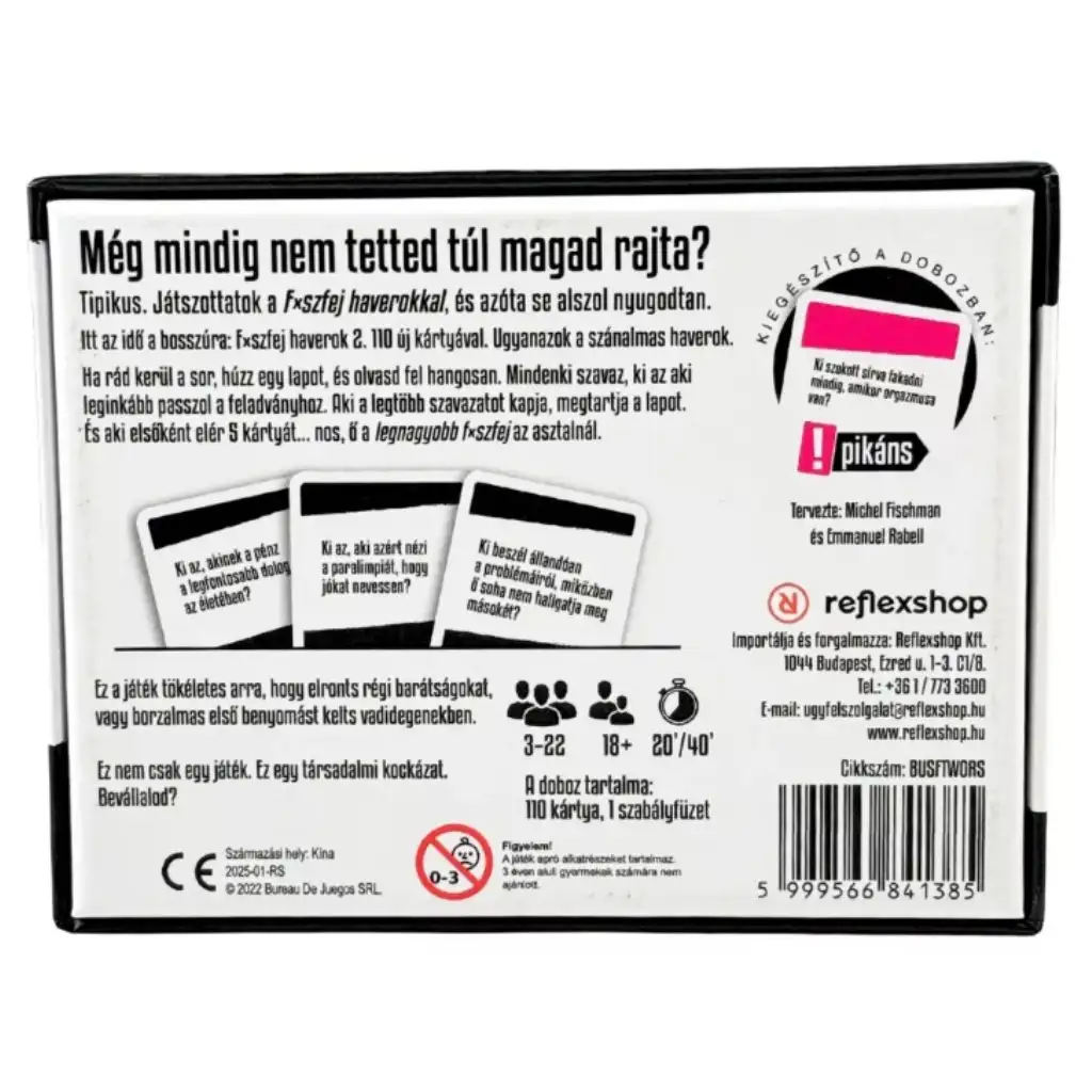 Fxszfej haverok 2 – il gioco di società brutalmente onesto e divertente da farti lacrimare dal ridere torna con un seguito in cui ancora una volta il bersaglio siete voi e la vostra compagnia di amici. Pesca una carta, leggi la domanda, poi senza pensarci troppo ognuno indica chi, tra voi, “si adatta di più” alla situazione descritta. Qui non si va per il sottile: solo verità scomode, discussioni ad alta voce e quel tipo di risate che ti fanno venire il mal di pancia.