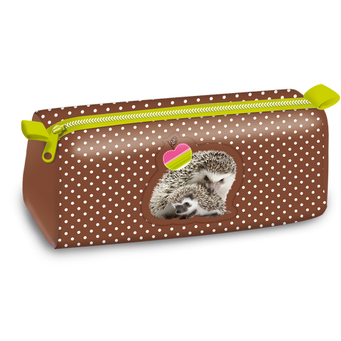 Questo astuccio, decorato con un adorabile riccio e la sua mamma, è la scelta perfetta per te se cerchi un accessorio comodo per riporre la tua cancelleria. Grazie alla sua forma cilindrica e al vano interno unico e spazioso, puoi sistemare facilmente penne, matite e pennarelli di varie dimensioni. Si chiude con una cerniera sulla parte superiore e allinterno è foderato con un tessuto a fantasia. Lastuccio nei toni del verde e del marrone, che richiamano i colori del bosco, sarà sicuramente il tuo preferito.