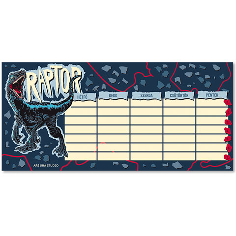 I film di Jurassic Park e Jurassic World hanno riscosso un enorme successo, e da allora i bambini, se possibile, amano ancora di più i dinosauri: perciò questo orario con motivo Raptor sarà sicuramente un pezzo apprezzato nellastuccio. Lorario Ars Una è composto da un unico foglio, ma è stampato su due lati, così puoi segnare sia la settimana A sia la settimana B. Lorario è in lingua ungherese, realizzato in carta patinata semilucida da 250 g, i cui colori sono splendidi e su cui è possibile scrivere sia con penna sia con matita. Lorario entra nella maggior parte degli astucci, così è sempre a portata di mano e in vista.
