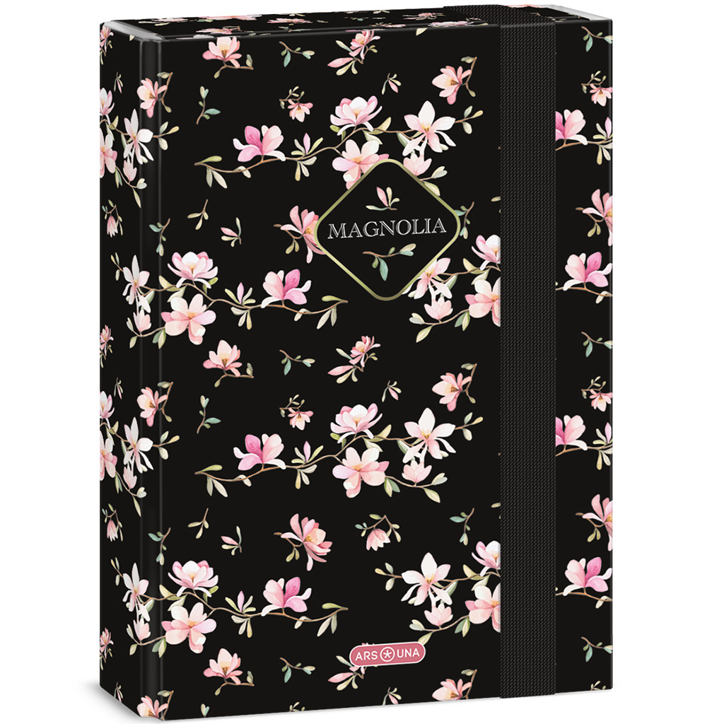 Lo scatolone per quaderni Ars Una: Magnolia A/5 è la scelta perfetta se cerchi una soluzione davvero elegante e pratica per organizzare il materiale scolastico di tuo figlio. I fiori di magnolia, posizionati con delicatezza sullo sfondo nero, conferiscono un aspetto pulito ma al tempo stesso particolare, così si distinguerà sicuramente dagli altri. Il rivestimento in cartone rigido e resistente protegge quaderni e documenti dalle pieghe, mentre lelastico assicura che tutto rimanga saldamente al suo posto. Ideale per la scuola, per le attività extra-scolastiche o anche per luso domestico.
