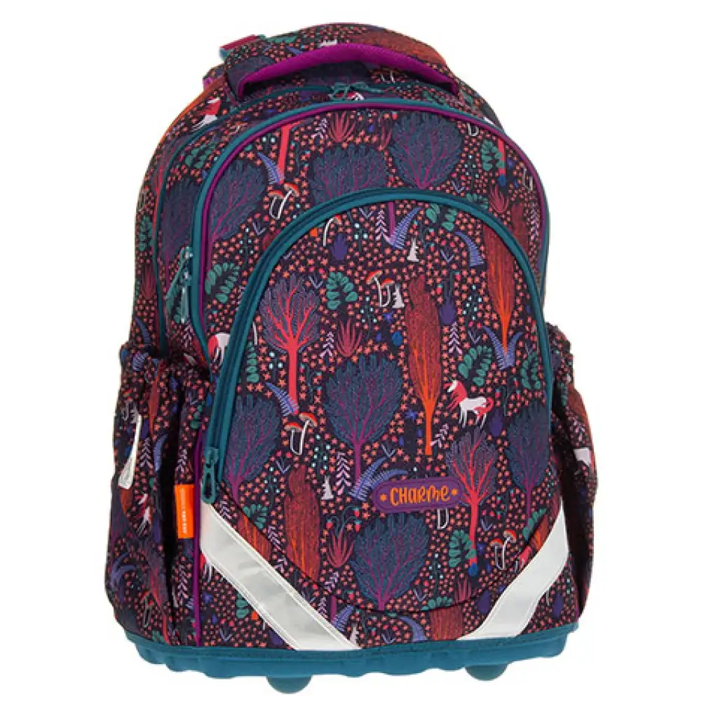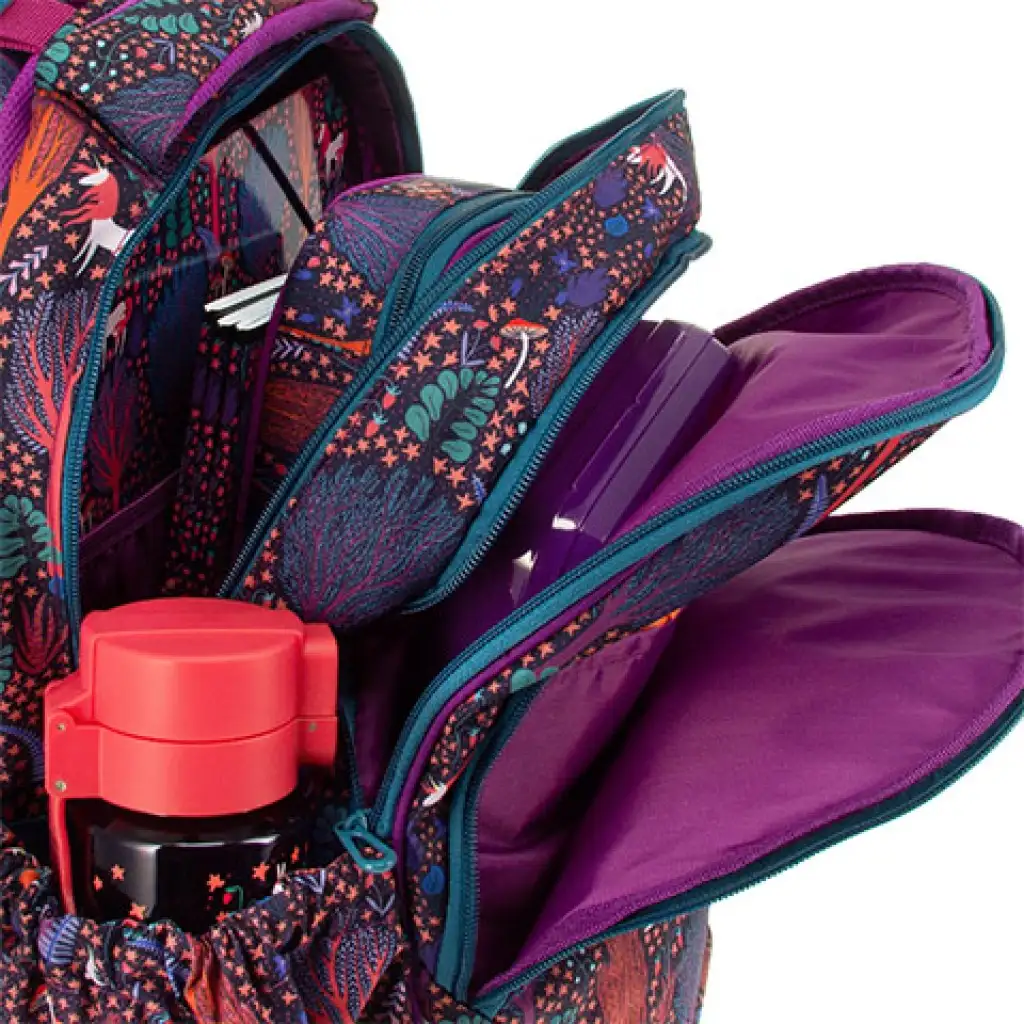 La colorazione dello zaino Charme è speciale, come se vedessimo disegnato sul lato una foresta fiabesca con conigli e unicorni. Sarebbe sicuramente un bel regalo per le ragazze, soprattutto in occasione dellinizio della scuola. Questo zaino è progettato appositamente per gli studenti delle scuole elementari, con spallacci larghi e imbottiti regolabili in più punti e una parte posteriore imbottita per proteggere la colonna vertebrale, garantendo che i pesanti libri di testo gravino il meno possibile sulla schiena dei bambini. La durata dello zaino è garantita dallottima qualità del materiale resistente e dalla base in plastica posizionata nella parte inferiore. Infine, ma non meno importante, vale la pena menzionare che lo zaino è ben organizzato allinterno, grazie ai tre scomparti e alle ulteriori tasche più piccole. Inoltre, lo zaino non è solo bello, ma grazie alle sue ampie superfici riflettenti, offre uneccellente visibilità durante il crepuscolo precoce.
