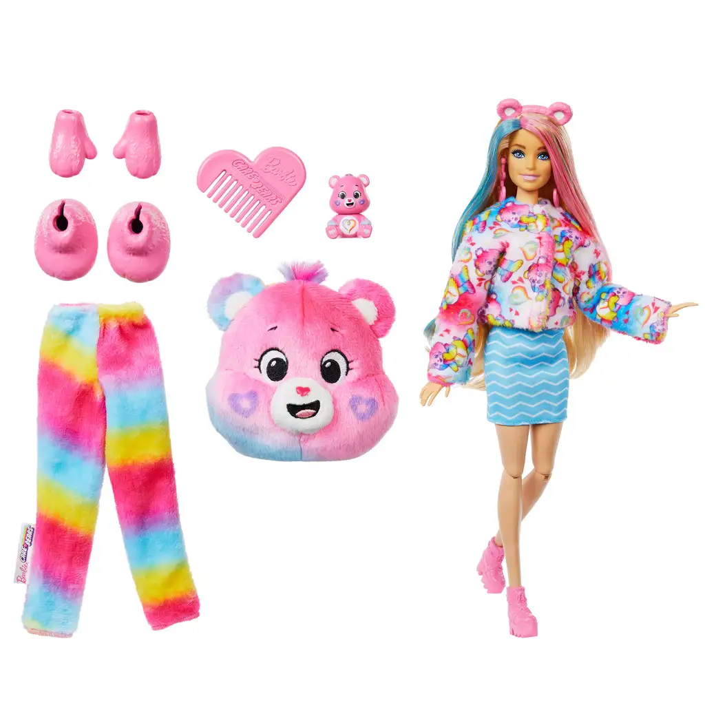 Scopri il mondo Barbie più dolce che ci sia, dove ti aspettano un’esplosione di colori e l’abbraccio dei teneri Care Bears! La Barbie: Cutie Reveal – Orsetto dal Cuore Tenero è uno dei pezzi più adorabili della seconda serie dedicata ai Care Bears e contiene ben 10 fantastiche sorprese. Anche solo aprire la confezione è una vera magia: ti accoglierà un soffice costume di peluche arcobaleno, e se lo togli, scoprirai una bellissima Barbie snodabile. Il divertimento però non finisce qui: ogni accessorio aggiuntivo regala nuova gioia, e i bambini potranno scoprire con entusiasmo gli elementi nascosti.