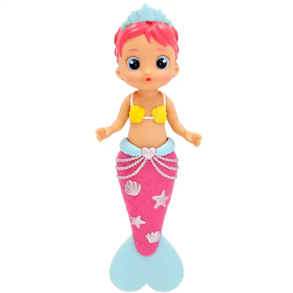 Il design di Melanie è davvero incantevole: ha una coda da sirena rosa decorata con conchiglie d’argento e stelle, una pinna azzurra e una cintura con una fibbia a forma di cuore. Il suo top è un reggiseno a conchiglia giallo brillante, mentre i suoi capelli sono ornati da ciocche rosa e da una corona a forma di stella marina azzurra, che si abbina perfettamente al suo stile da principessa. I colori vivaci e i dettagli raffinati trasformano ogni bagnetto in una vera favola.