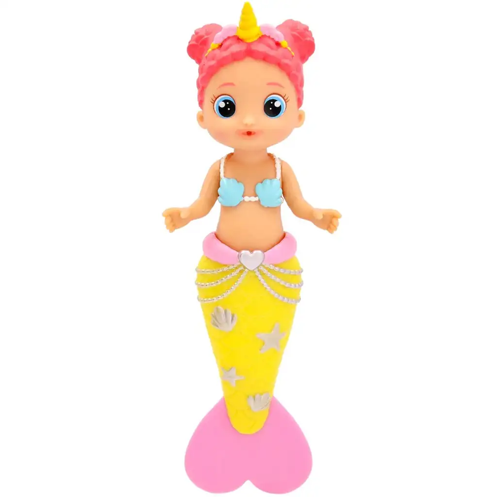 Naomi ha una coda da sirena giallo chiaro e una pinna rosa decorata con stelle, conchiglie e collane di perle. La cintura in vita è impreziosita da una fibbia a forma di cuore, mentre il top azzurro a forma di conchiglia crea un contrasto vivace con il resto dei colori. Il suo viso adorabile è incorniciato da capelli rosa e da un corno di unicorno giallo, che trasformano Naomi in un vero personaggio da fiaba: sirena, principessa e unicorno allo stesso tempo!