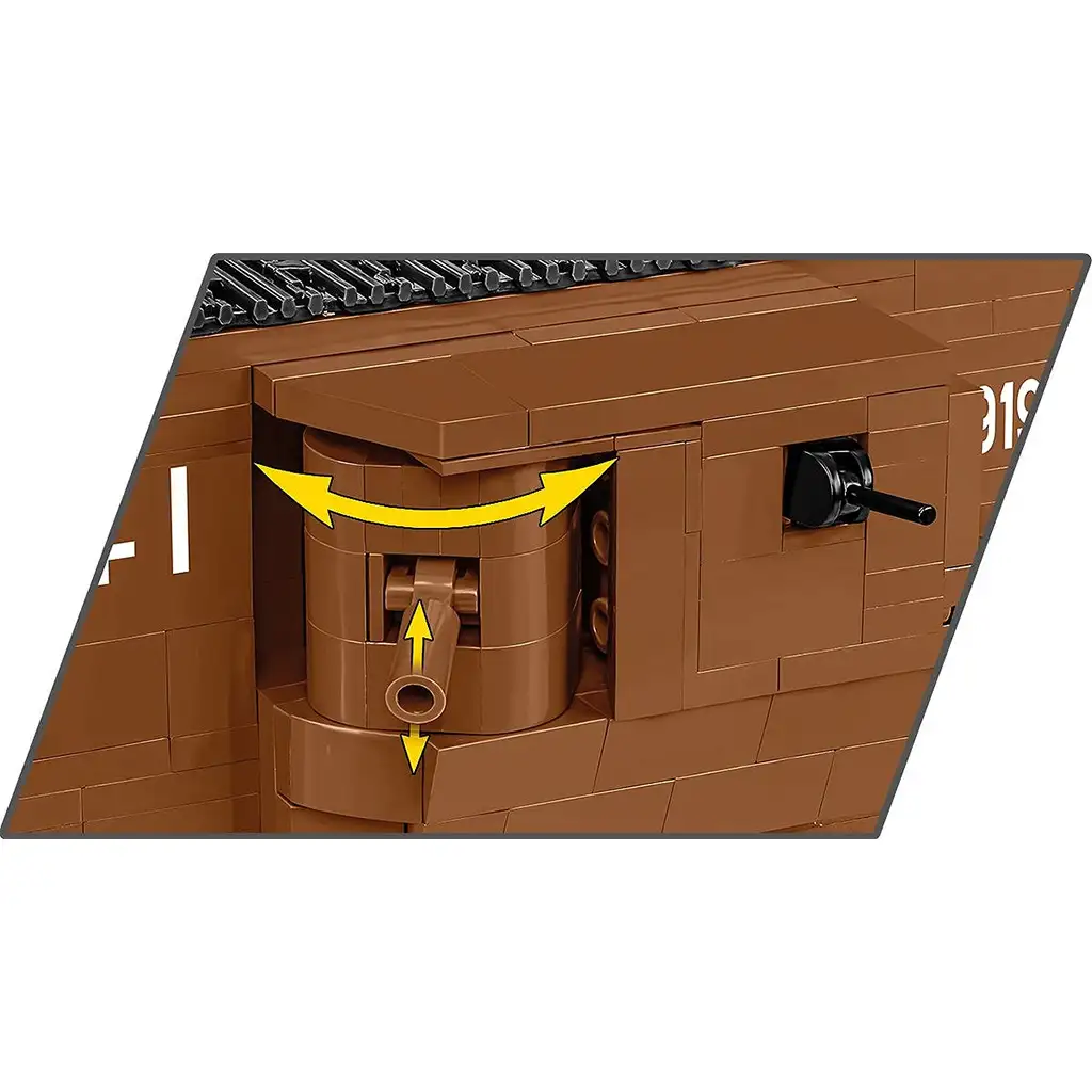 Il set di costruzione COBI Mark V (Male) No. 9199 rappresenta uno dei carri armati britannici più noti della Prima Guerra Mondiale, basato sull’esemplare originale conservato nella collezione del Bovington Tank Museum. Il Mark V era uno dei veicoli cingolati più avanzati del suo tempo, utilizzato per sfondare il fronte e supportare la fanteria. Questo modello dettagliato può essere assemblato in scala 1:35 ed è composto da 844 pezzi di alta qualità. Le dimensioni del veicolo assemblato sono: 23 cm di lunghezza, 13 cm di larghezza e 9 cm di altezza.