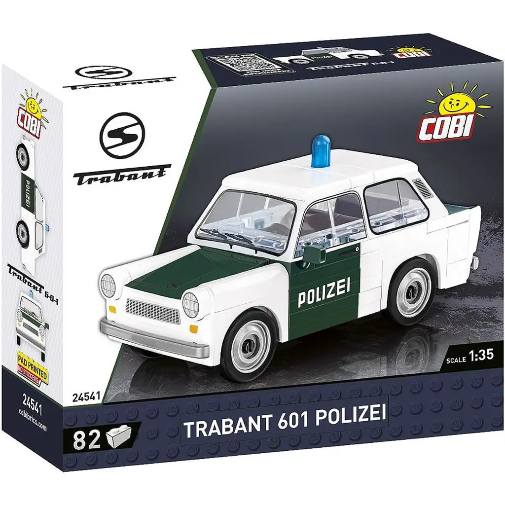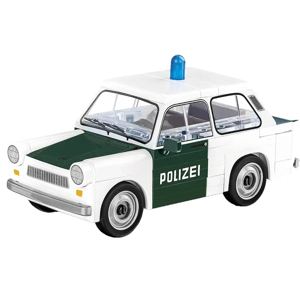 La Trabant 601 Polizei fa parte della collezione COBI Youngtimer, che presenta il modello iconico della produzione automobilistica della Germania dellEst nella versione della polizia. Il set di costruzione è in scala 1:35, rappresentato con colori autentici bianco e verde e dotato di luci della polizia blu. La modellino finito è lunga circa 10 cm, larga 5 cm e alta 4,5 cm.