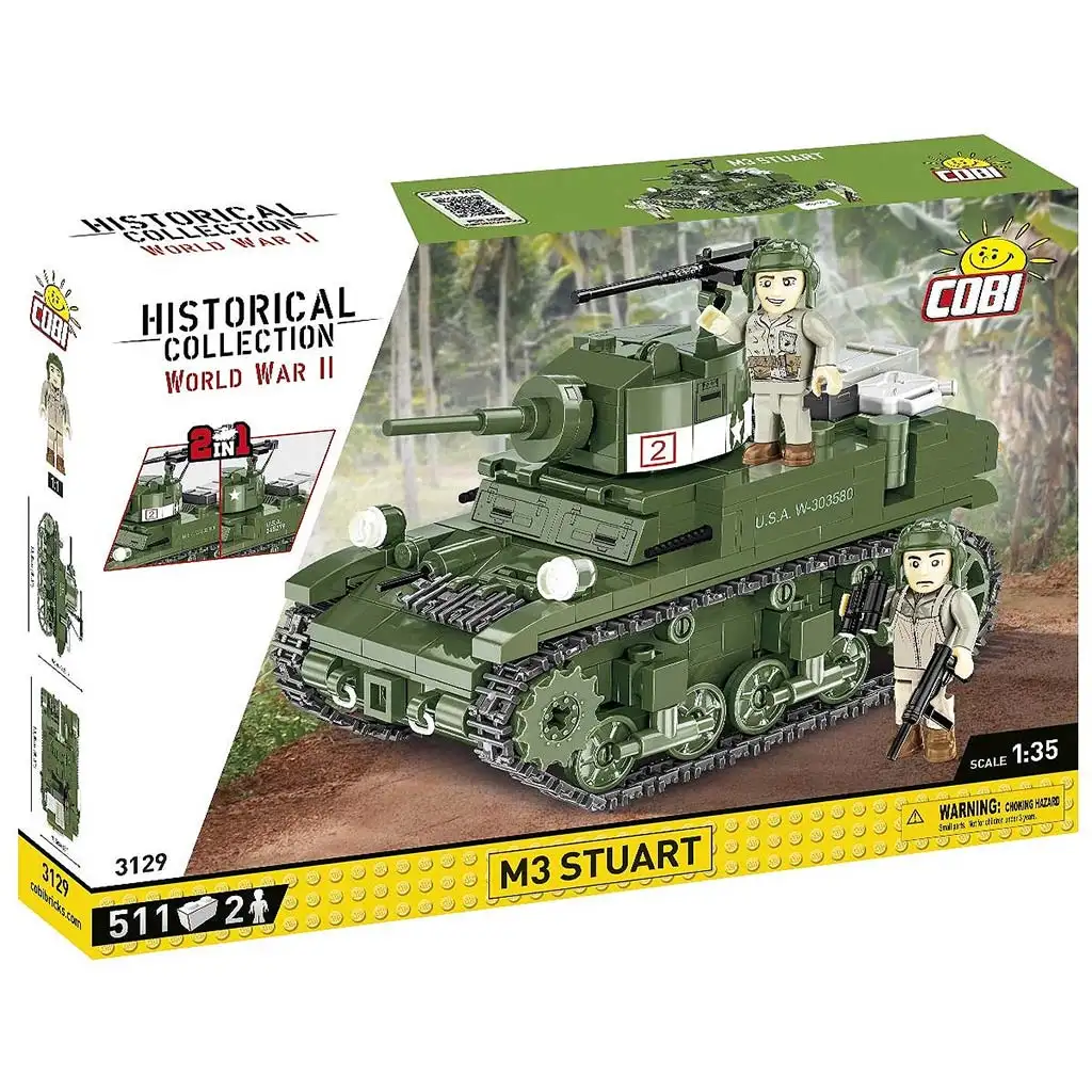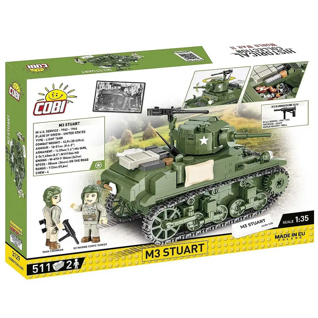 Il gioco di costruzione COBI M3 Stuart è un micro modello dettagliato e interattivo che richiama il carro armato leggero americano utilizzato durante la Seconda Guerra Mondiale. Il set è composto da 511 pezzi, con i quali si può assemblare un modello in scala 1:35 di circa 13,5 cm di lunghezza, 7,5 cm di larghezza e 9 cm di altezza. La cura dei dettagli comprende cingoli funzionanti, torretta girevole, cannone mobile, portello della struttura apribile e un motore in blocchi nascosto come dettaglio. Sulle fiancate del veicolo possono essere stampati diversi contrassegni teatrali – a scelta in stile operazioni europee o del Pacifico – così il modello è personalizzabile a seconda del fronte che interessa di più.