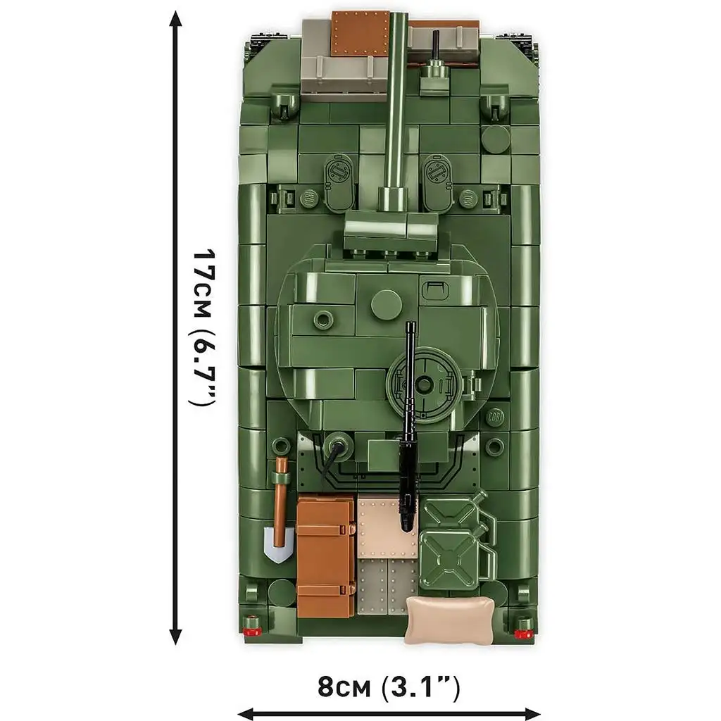 Il gioco di costruzione COBI M4A1 Sherman è un modello impressionante e ricco di dettagli dell’iconico carro armato medio americano della Seconda Guerra Mondiale, lo Sherman. Il set è composto da 663 mattoncini di alta qualità, realizzato in scala 1:35; il modello finito misura circa 17 cm di lunghezza, 11,5 cm di altezza e 8 cm di larghezza. Durante la costruzione emergono dettagli realistici come i cingoli funzionanti, la torretta girevole, il cannone mobile, il portello apribile della sovrastruttura e un modellino di motore nascosto in un piccolo blocco. Il set include anche due minifigure: un carrista americano con elmetto e mitra M3 “Greaser”, e un soldato di fanteria con cappotto pesante e fucile M1 Garand. Fa parte del set anche un elemento decorativo da diorama: un segmento di recinzione con cespuglio.