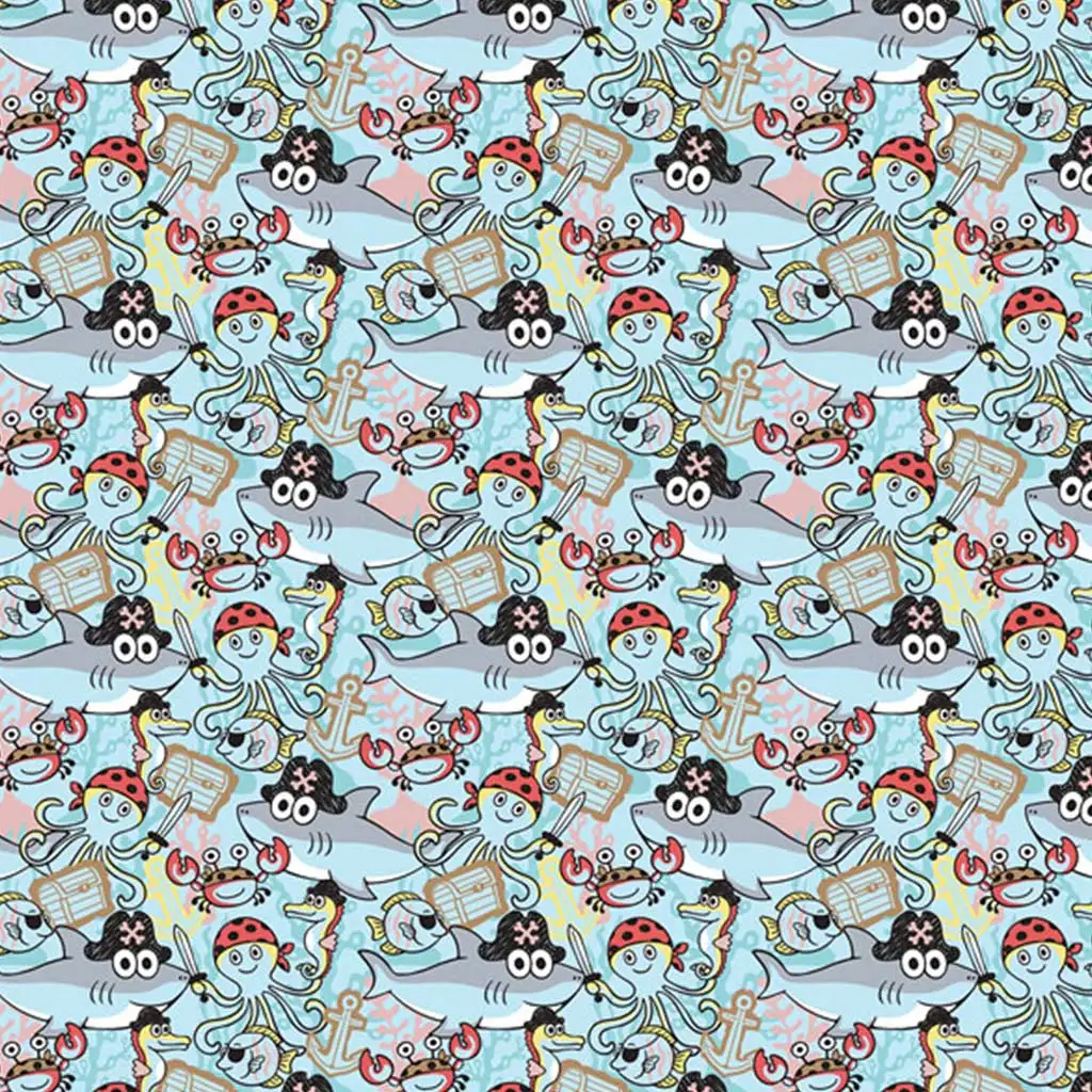 Sorprendi i più piccoli con una confezione che richiama l’atmosfera di una vera avventura marina! La carta da regalo Avventura Marina dei Pirati, nel formato 100x70 cm, è la scelta perfetta per i regali dei bambini, perché ogni centimetro quadrato è pieno di dettagli entusiasmanti: polpi sorridenti con spada e cappello da pirata, squali con benda sull’occhio, piccoli granchi, ancore, serpenti marini, scrigni del tesoro e tante altre allegre figure marine danzano su uno sfondo azzurro chiaro.