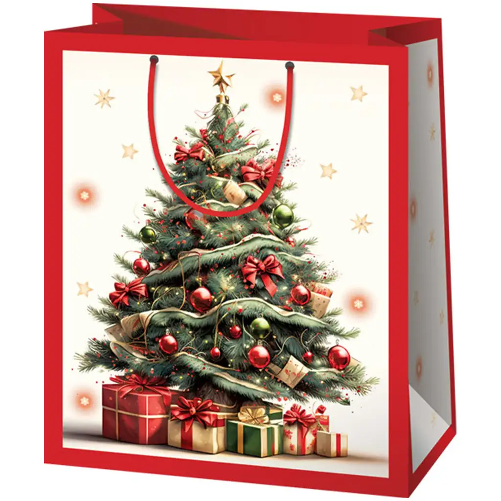 Se vuoi davvero evocare la classica atmosfera natalizia, questa borsa regalo Cardex di medie dimensioni (17x10x23 cm) sarà la scelta perfetta. Al centro della borsa si trova un albero di Natale riccamente decorato, coronato da una stella, circondato da colorate scatole regalo, palline rosse e verdi, nastri e fiocchi festivi. La vivace cornice rossa rende il design ancora più accattivante, così già a prima vista sarà una gioia consegnarla.