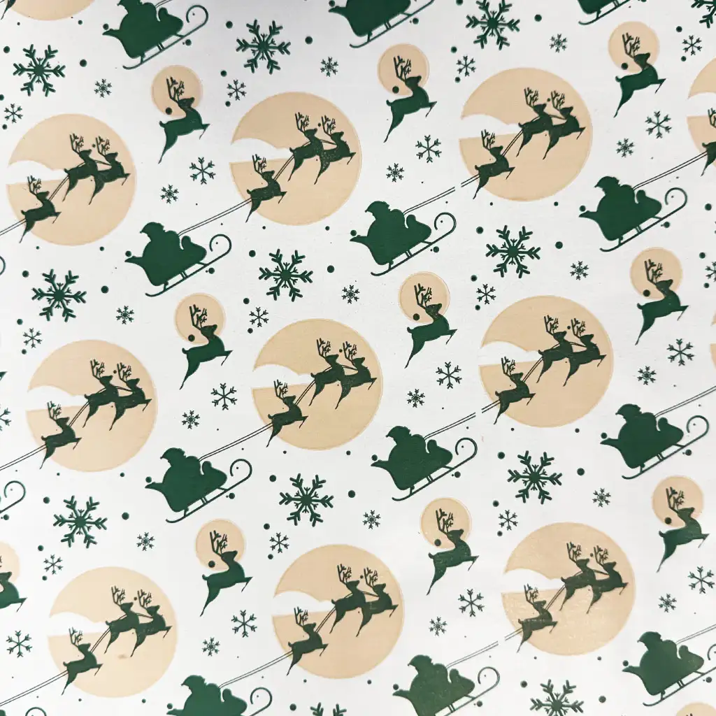 Porta il piacere di fare regali in una magica avventura notturna con questa speciale carta da regalo “Santa’s Sleigh Ride”! Il motivo evoca una classica atmosfera natalizia: la slitta di Babbo Natale vola davanti alla luna piena, trainata dalle renne in corsa, mentre fiocchi di neve e stelle completano lo scenario. Le tonalità verdi e dorate si armonizzano perfettamente sullo sfondo bianco, creando un effetto elegante ma giocoso.