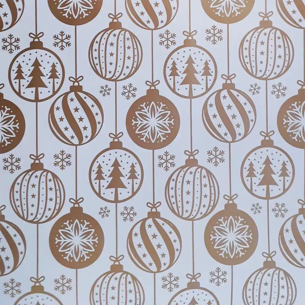 La carta da regalo con motivi di decorazioni natalizie dorate è una scelta elegante e festosa che dona un aspetto esclusivo ai tuoi regali. I decori natalizi, i fiocchi di neve e gli alberi di Natale dorati su sfondo bianco riflettono uno stile raffinato e moderno, rendendo ogni regalo davvero speciale.