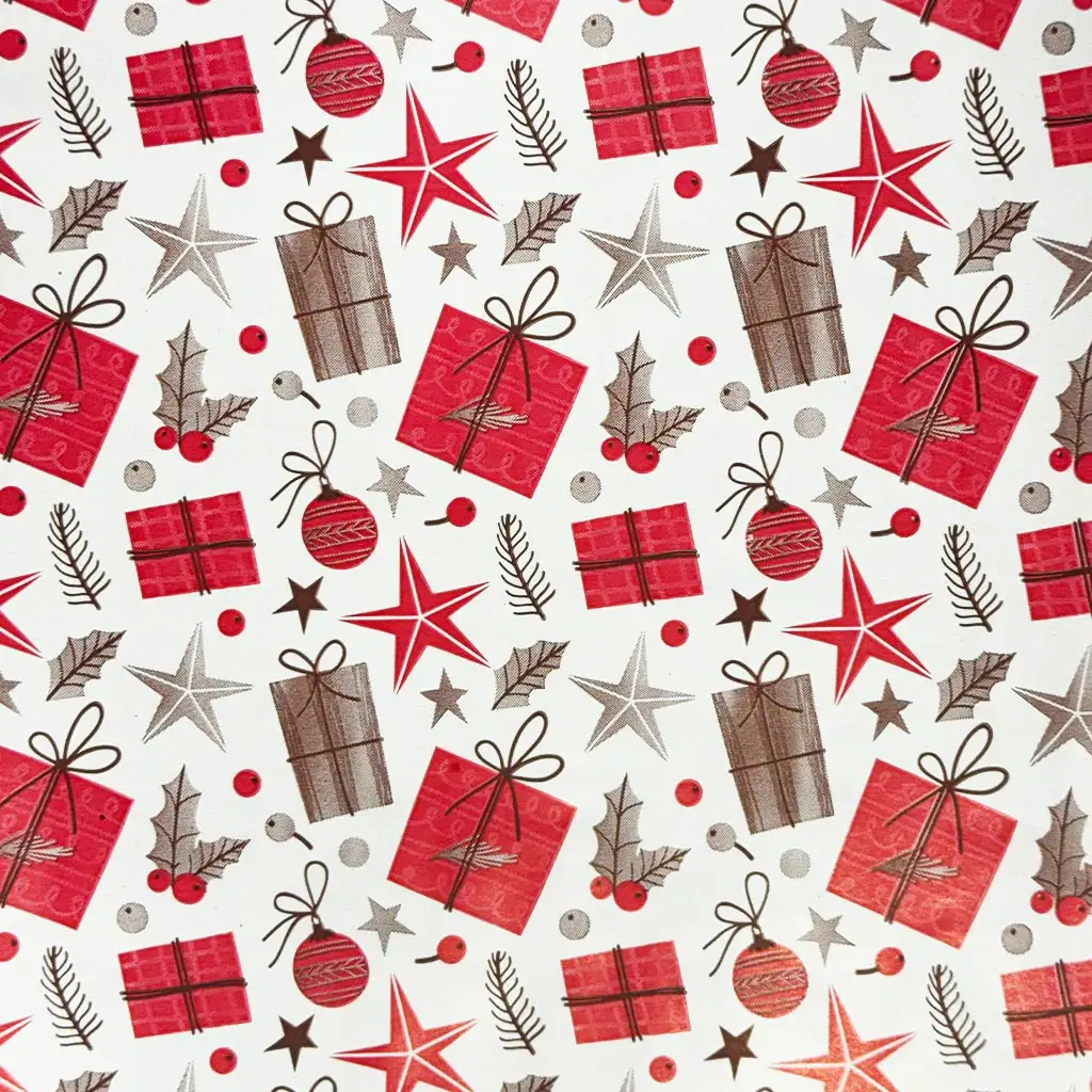 Rendi davvero festosi i tuoi regali di Natale con questa vistosa e stilosa carta da regalo "Red Festive Joy"! Ogni centimetro quadrato richiama la classica atmosfera natalizia: scatole regalo rosse e marroni, stelle, bacche, rami di pino e palline decorative si ripetono su uno sfondo bianco, creando una perfetta armonia festiva. I motivi vari sono giocosi ma armoniosi, così che il regalo incartato offra un’esperienza speciale già al primo sguardo.