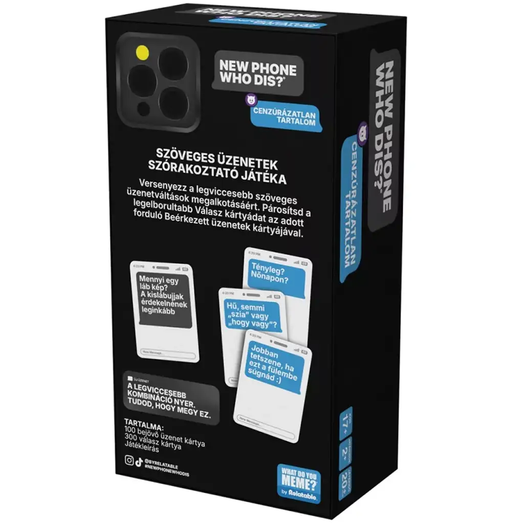 What Do You Meme? – New Phone Who Dis? (Contenuto non censurato) è un gioco da tavolo audace e diretto, progettato specificamente per adulti. Lo scopo del gioco è abbinare alle carte "messaggio in arrivo" le risposte più folli, divertenti o sorprendenti tra le proprie carte "risposta", creando così la conversazione più imbarazzante o esilarante possibile. Vince chi, secondo il giudice del turno, realizza la combinazione migliore.
