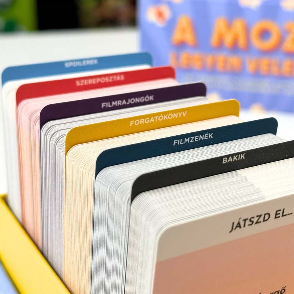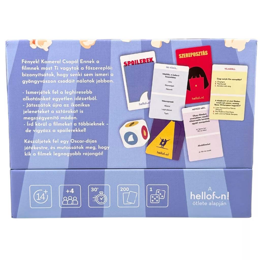 Il gioco da tavolo „A mozi legyen veled!” è un vero colpo sicuro se vuoi organizzare una serata allegra e piena di risate per la famiglia o per i ragazzi più grandi. Questo gioco è una vera scatola di avventure cinematografiche, in cui si susseguono prove emozionanti e creative, così ognuno trova il suo ruolo preferito. Durante il gioco sarete voi i protagonisti: potrete riconoscere i film più celebri anche da una sola citazione, recitare le scene più iconiche o aiutare gli altri con delle descrizioni – naturalmente senza spoiler!