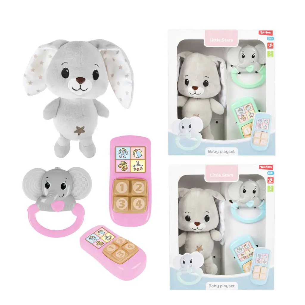 Il coniglietto di peluche A Little Stars con sonaglio e telefono è un adorabile e versatile set di giochi, perfetto per i più piccoli. Il soffice e dolce coniglietto di peluche può diventare rapidamente il compagno di sonno e di gioco preferito del bambino, essendo realizzato in un materiale piacevole al tatto, quindi ideale per coccole e rassicurazione. Il sonaglio a forma di elefante incluso è facile da impugnare per le manine piccole, mentre i suoni delicati catturano lattenzione del bambino e aiutano lo sviluppo uditivo.