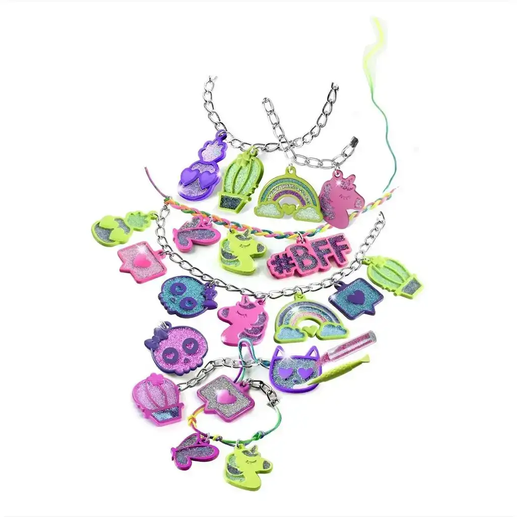 Il set creativo per braccialetti con ciondoli Crazy Chic è una scelta eccellente per le ragazze entusiaste che desiderano creare accessori unici. Con questo set, possono realizzare braccialetti di tendenza progettati da loro stesse, da indossare o da regalare come doni affettuosi ad amici e familiari. La confezione contiene tutti i componenti essenziali, come fili, catene in alluminio, glitter scintillanti e elementi decorativi in plastica, che si trovano in un pratico supporto di cartone per collane. Il gioco non solo stimola la creatività, ma sviluppa anche le abilità motorie fini e la destrezza manuale. Sebbene le istruzioni aiutino nella creazione dei braccialetti, è importante notare che il set non include colla vinilica.