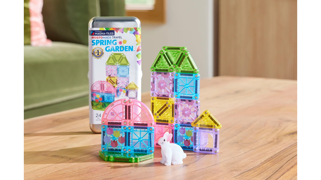 La collezione ora include il set da viaggio primaverile da 24 pezzi microMAGS, che offre elementi dai colori pastello e motivi floreali. I bambini possono costruire sculture a tema primaverile utilizzando i sei triangoli equilateri, una figura di coniglio, una finestra ad arco, quattro triangoli rettangoli, quattro quarti di cerchio, quattro quadrati e quattro quadrati decorati con fiori presenti nel set.