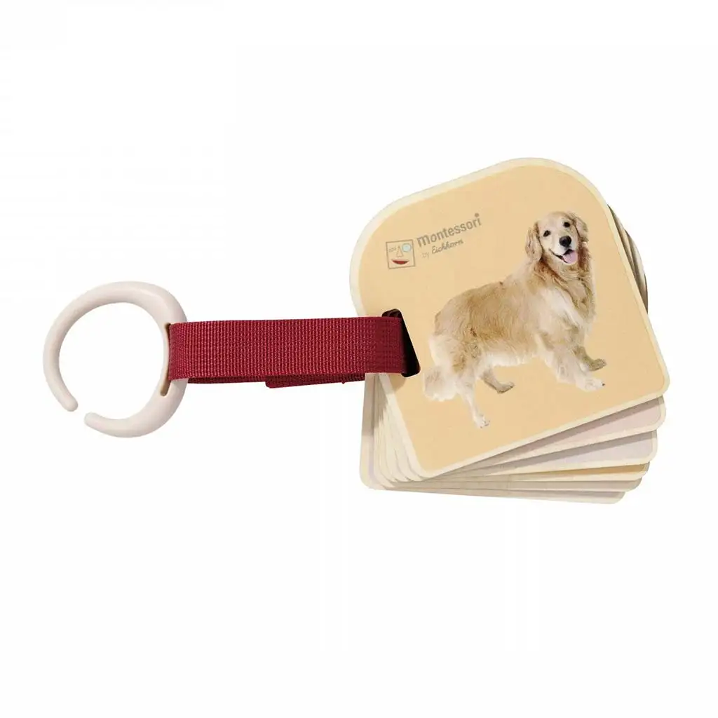 Ogni pagina del libretto presenta una fotografia realistica di animali domestici e insetti, come ad esempio un cane, una farfalla o una lumaca – in questo modo i bambini possono conoscere già da piccoli immagini tratte dalla realtà, che stimolano lo sviluppo delle capacità di osservazione. Le carte sono realizzate in legno resistente, con angoli arrotondati, per garantire la massima sicurezza anche per le mani più piccole.