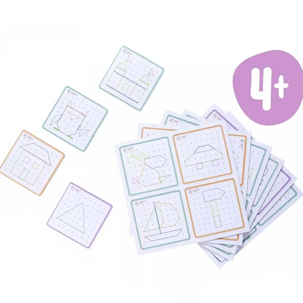 Il gioco consiste nel tendere elastici di diversi colori e dimensioni attorno ai pioli metallici disposti sulla tavola, creando così forme semplici o più complesse – che si tratti di una casetta, di una figura di animale o anche di un motivo simile a un mandala. Il set include anche carte modello che permettono ai bambini di seguire dei disegni oppure di sperimentare liberamente con le forme.