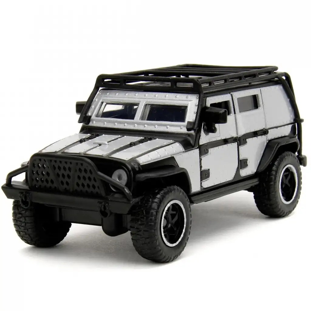 La Charger R/T nera di Dom, con il suo aspetto muscoloso e aggressivo, richiama subito i momenti più emozionanti dei film. Le ruote off-road con bordo rosso e la ruota di scorta posteriore le conferiscono un look davvero pronto per l’avventura. Il fuoristrada Jeep Wrangler di Tej, invece, è corazzato con una livrea nero-argento, dotato di portapacchi sul tetto e robusti paraurti – pronto anche per le azioni più dure.
