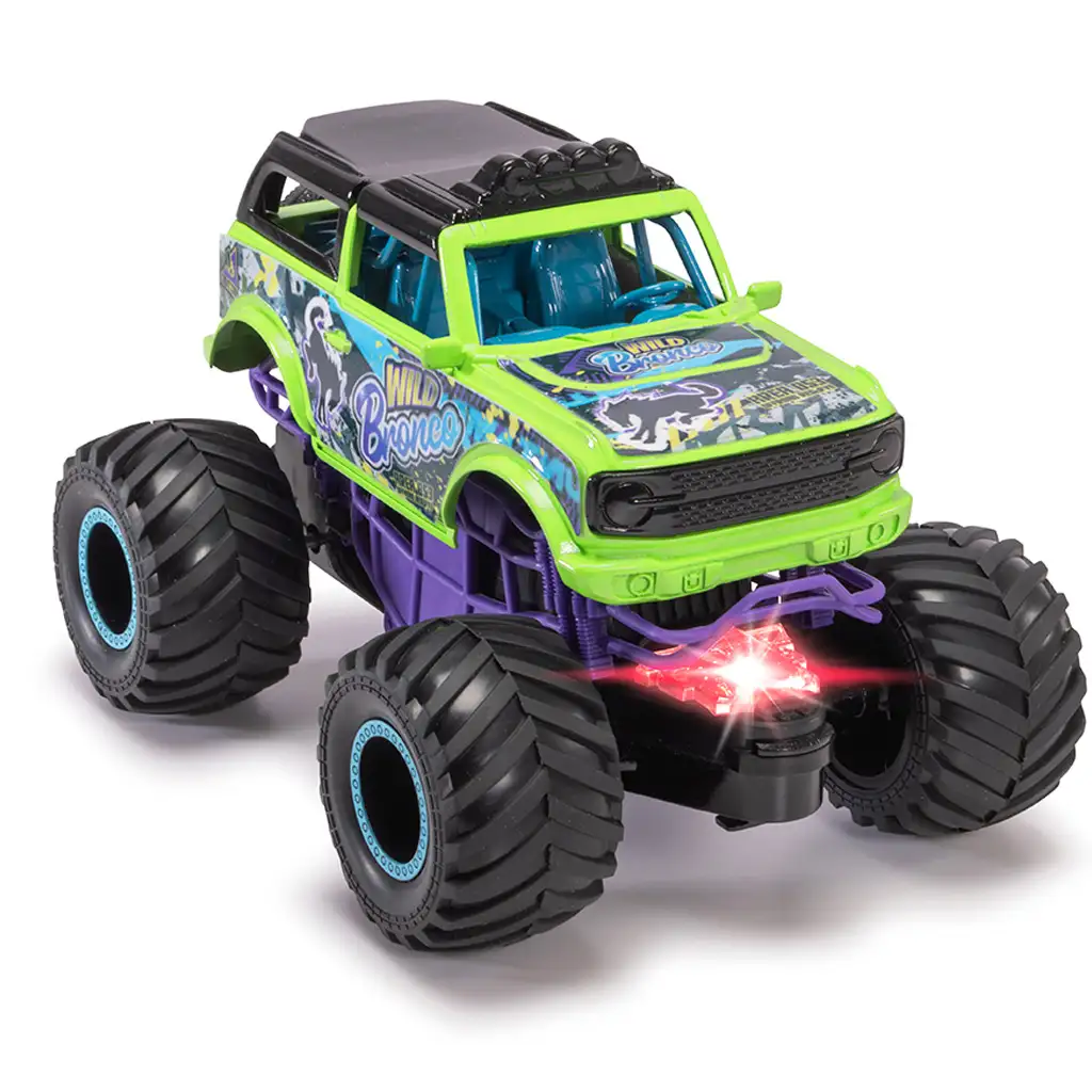 La combinazione di colori verde-viola-nero, le enormi ruote da monster truck e le grafiche “Wild Bronco” creano una vera atmosfera da gara. L’auto funziona con meccanismo a retrocarica: basta tirarla all’indietro e sfreccia subito in avanti – si può usare anche senza batterie, ma per un’esperienza ancora più incredibile il modulo luce e suono incorporato incanterà i bambini.