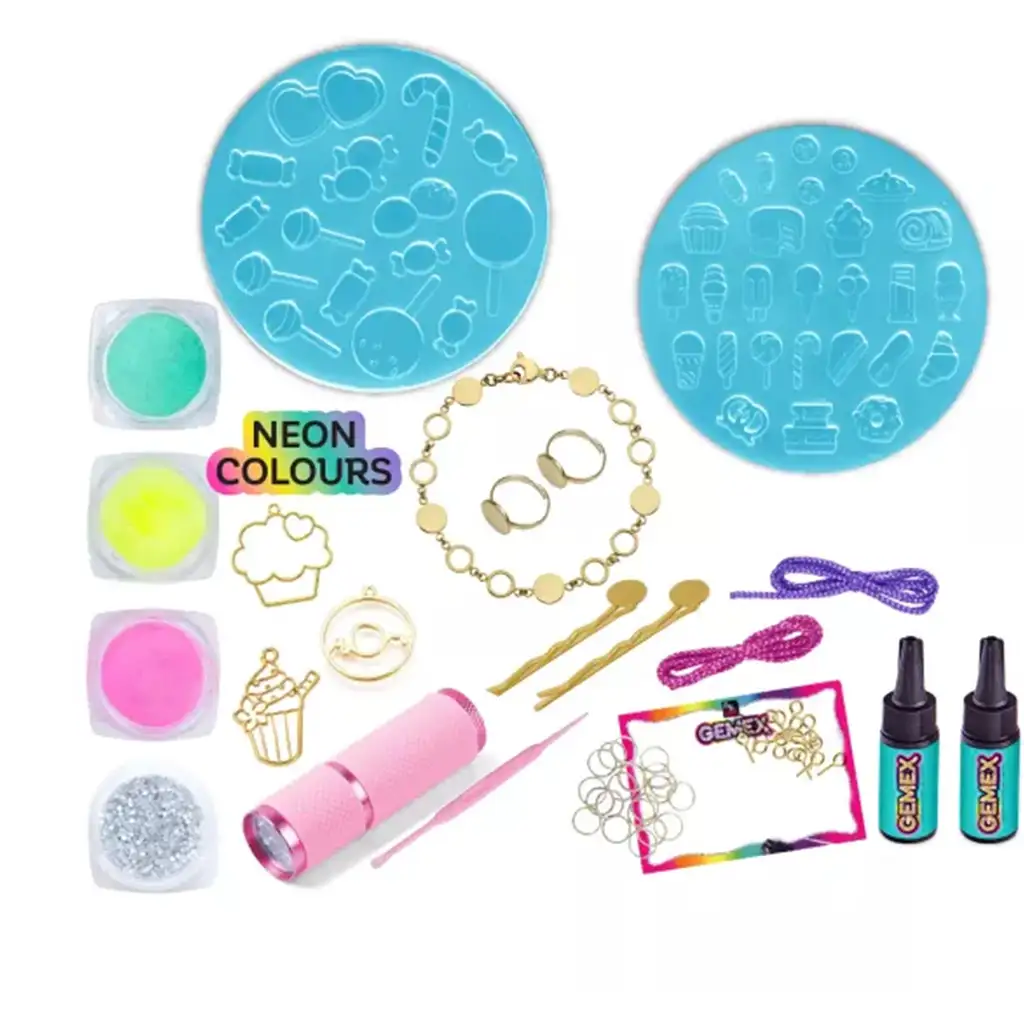 Con l’aiuto del set, i bambini possono realizzare i propri gioielli, come anelli, braccialetti, fermagli per capelli o ciondoli, combinando gel colorati neon e glitter. Le diverse forme a tema dolci – ciambelle, lecca-lecca, muffin – conquisteranno sicuramente il cuore di ogni piccolo artista. Il glitter mescolato al gel rende il risultato ancora più spettacolare, e la lampada UV inclusa solidifica in pochi istanti le creazioni in gel.