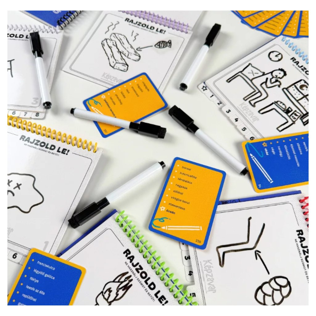 Képzavar è un gioco da festa vivace e garantito per far ridere, dove la mancanza di talento nel disegno non è uno svantaggio, ma addirittura un vantaggio. Il gioco inizia come una semplice catena: ogni giocatore disegna unespressione, poi passa il proprio taccuino, dove il giocatore successivo cerca di indovinare ciò che ha visto – e così via. Alla fine della catena la parola originale spesso è completamente deformata e nascono creazioni assolutamente assurde e divertenti. Il momento più bello arriva quando i taccuini tornano ai loro proprietari e si scopre come, per esempio, un semplice “pupazzo di neve” si sia trasformato in qualcosa di del tutto inaspettato.