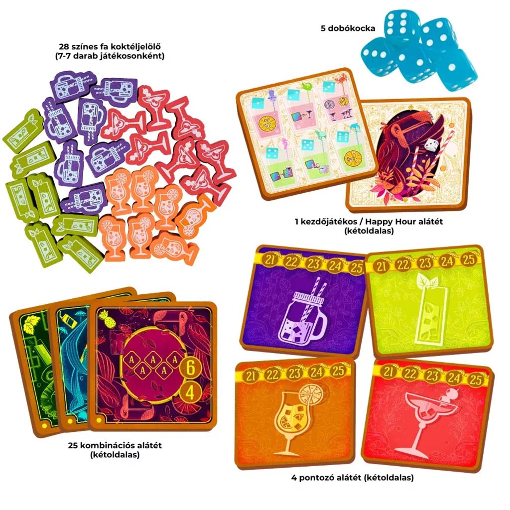 - Contenuto della scatola: 5 dadi a sei facce, 28 segnalini cocktail in legno, 30 sottobicchieri di gioco, 1 libretto delle regole