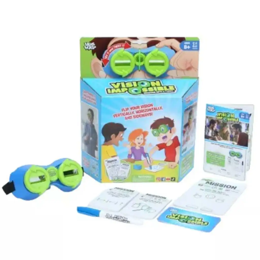 Preparati per un’esperienza di gioco completamente nuova, dove nulla è come sembra! La sfida Testa in Giù – Doppio Colpo è un gioco da tavolo che ribalta, letteralmente, il tuo mondo così come lo conosci! L’obiettivo del gioco è quello di completare compiti creativi e di abilità indossando degli speciali occhiali simili a un periscopio – mentre la tua visione del mondo viene capovolta, girata di lato o orizzontalmente.