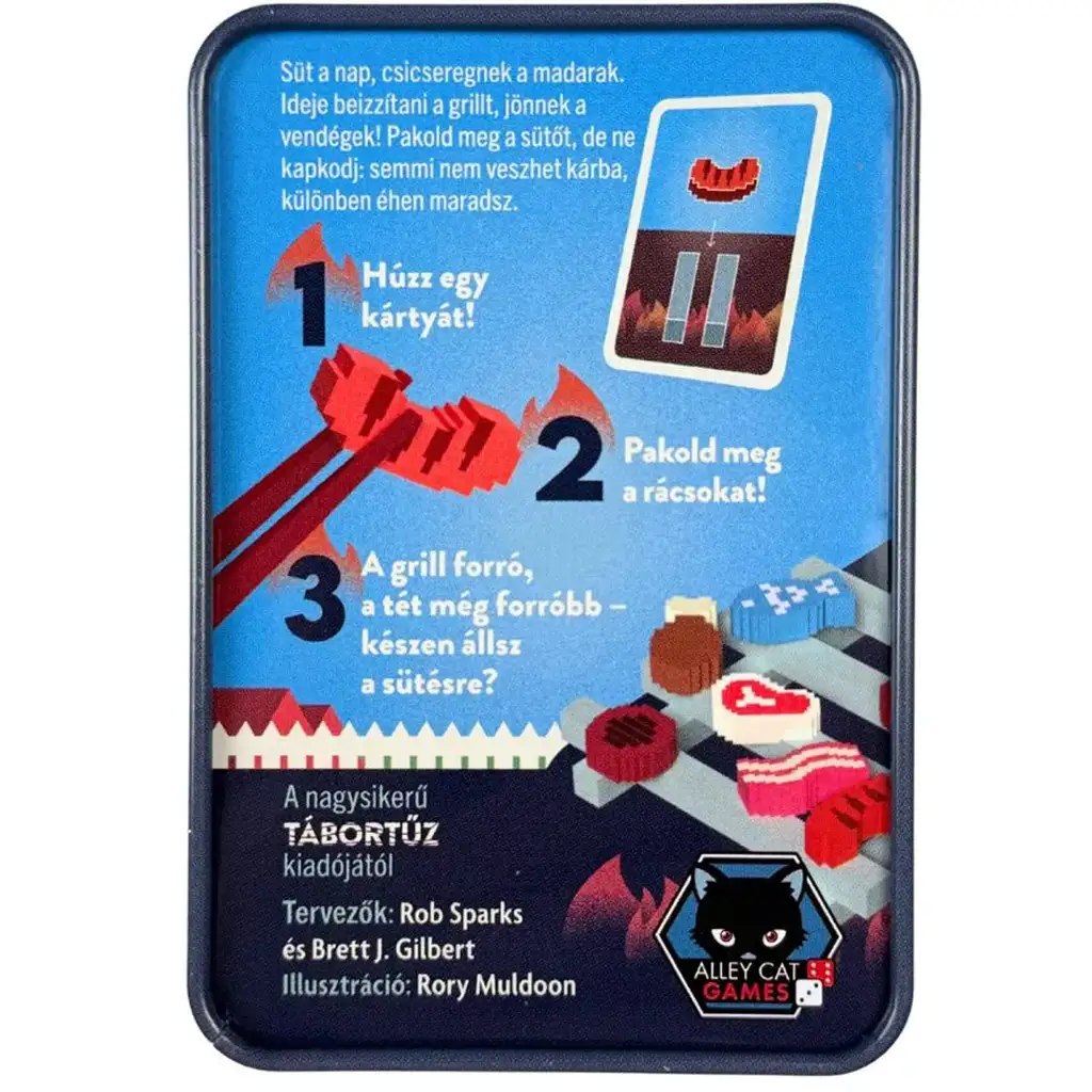 La meccanica del gioco è semplice ma estremamente divertente: pesca una carta, posiziona il pezzo di carne o verdura corrispondente sulla mini griglia e cerca di mantenere in equilibrio la griglia stessa… tutto questo usando una pinzetta! Ma fai attenzione: se sei troppo goloso o sbadato con le mani, tutto può cadere dalla griglia e resterai a digiuno!