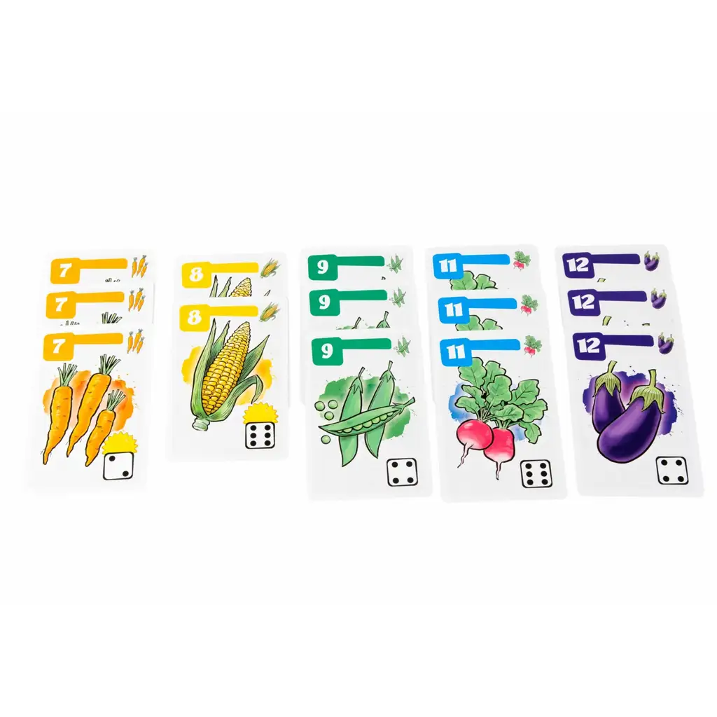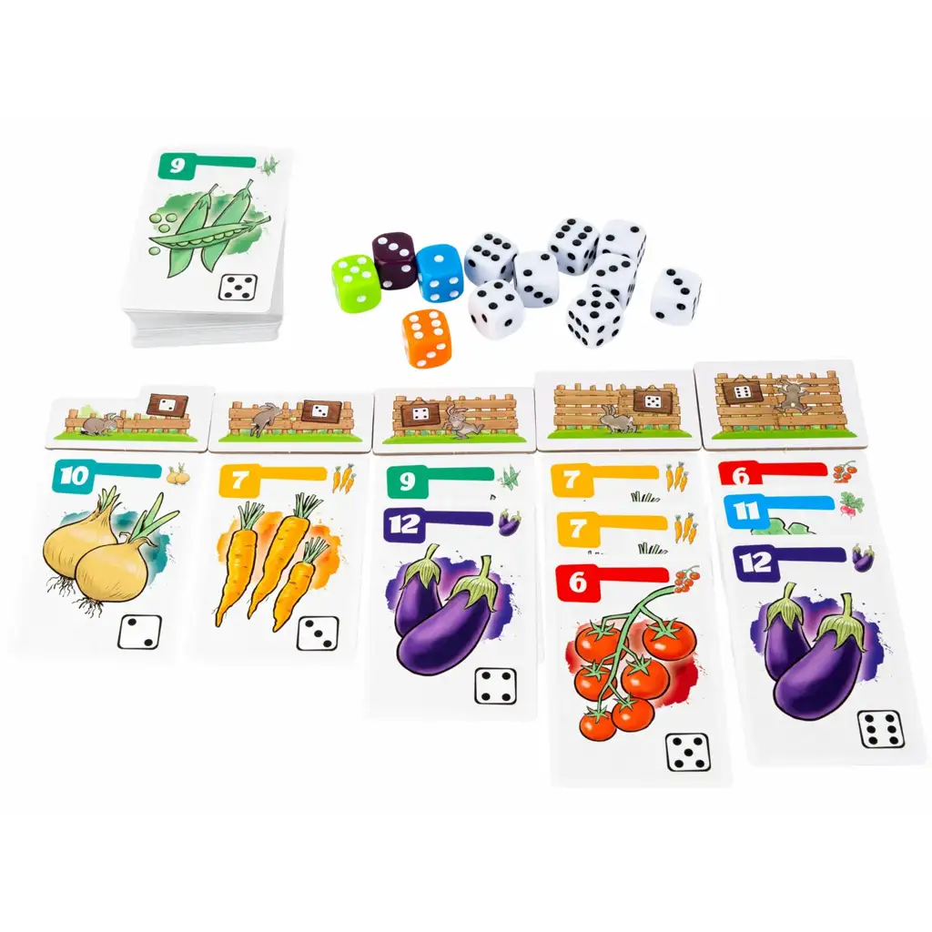 Durante il gioco, in ogni turno i dadi e le decisioni determinano quale verdura puoi ottenere. Puoi guadagnare punti in base ai valori e alle condizioni indicate sulle carte – ma non ogni lancio di dadi porta felicità! Infatti, il contadino può tornare dietro l’alta recinzione in qualsiasi momento e, in quel caso, bisogna scappare…
