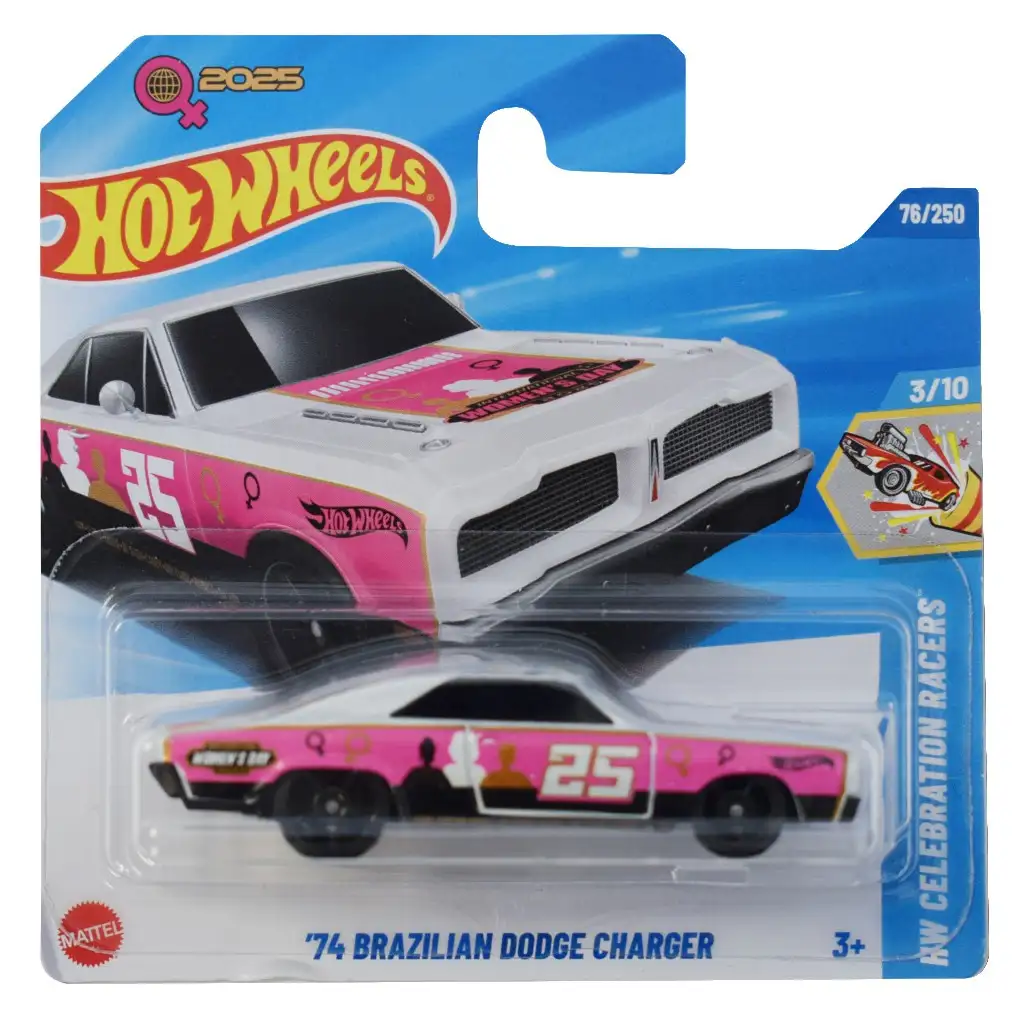 La macchinina Hot Wheels 74 Brazilian Dodge Charger è uno dei modelli più iconici della versione brasiliana delle classiche auto americane. Questo modello in scala 1/64 attira lattenzione con la sua verniciatura unica rosa e bianca e la grafica da auto da corsa. Il numero "25" visibile sul lato dellauto e i diversi simboli richiamano il mondo delle auto da corsa retrò. La cura nei dettagli e il design autentico rendono questo modello il preferito degli appassionati di automobili.