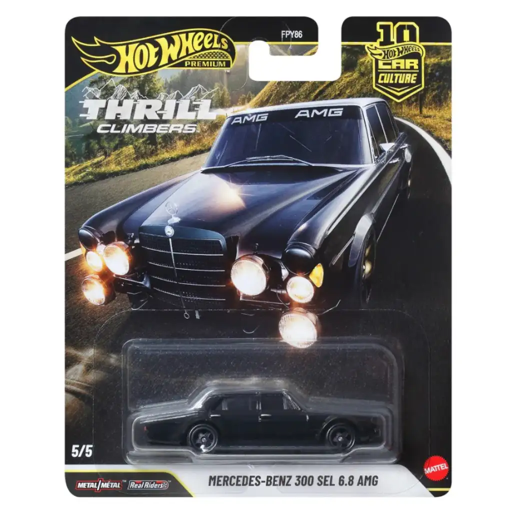 Il modello Mercedes-Benz 300 SEL 6.8 AMG della serie Hot Wheels Premium Cool-túra rende omaggio alla leggendaria auto da corsa "Red Pig", una delle icone del turismo automobilistico. Come parte della serie Thrill Climbers, questo modello richiama latmosfera dei tornanti di montagna e dei tracciati di gara impegnativi in scala 1:64.
