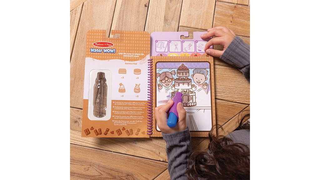 Bambini possono utilizzare la penna ad acqua ricaricabile, progettata appositamente per le mani piccole, per colorare le pagine con l’acqua e scoprire profumi delicati. Le pagine sono riutilizzabili più volte, così quando l’acqua si asciuga, i bambini possono giocare ancora e ancora. Disponibile con motivi Treats (dolci) o Fruits (frutta).