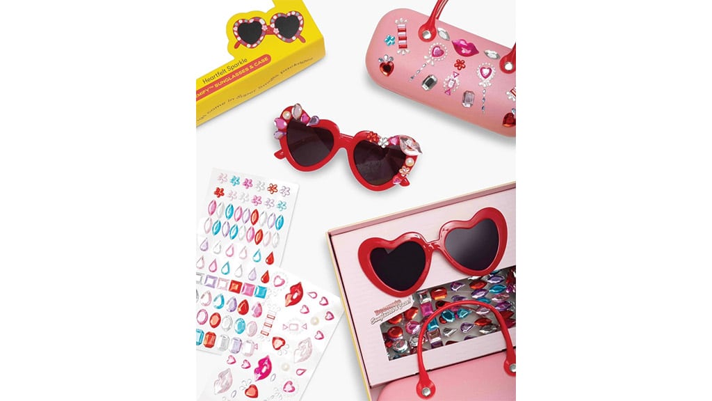 Questo set è allo stesso tempo un'attività creativa di fai-da-te e un accessorio scintillante e alla moda. I bambini possono decorare gli occhiali da sole rossi a forma di cuore, che offrono protezione UVA/UVB, e la borsetta rosa secondo il proprio gusto. Il pacchetto contiene più di 100 adesivi con strass brillanti a forma di cuore, labbra e caramelle, così ognuno può rendere davvero unico il proprio occhiale e custodia. Questo kit non solo offre un passatempo divertente, ma sviluppa anche la creatività e la manualità, mentre i bambini possono indossare con orgoglio un accessorio davvero stiloso e fatto da loro stessi.