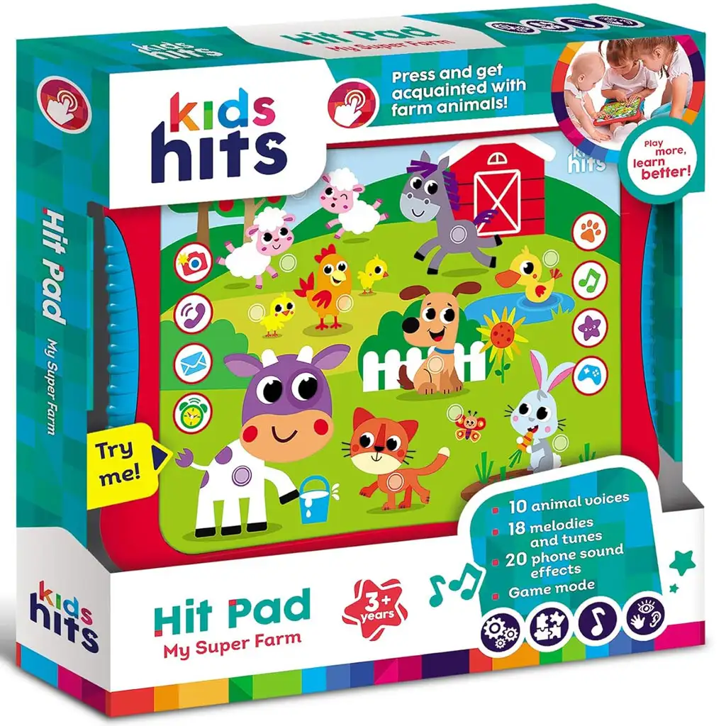 Kids Hits: Hit Pad - Il mio super fattoria è un gioco educativo interattivo che aiuta i bambini a scoprire gli animali della fattoria e i loro suoni, intrattenendoli con melodie allegre e funzioni interattive.