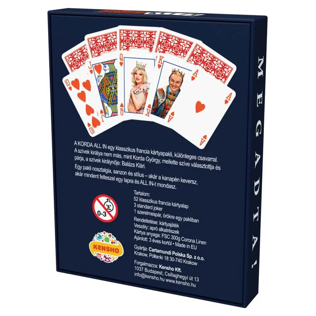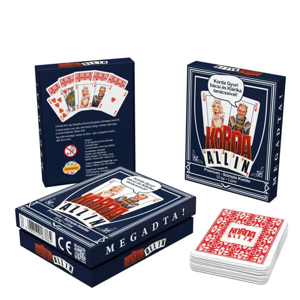 Il mazzo di carte francesi classico Korda All-in (52 carte + 3 jolly) diventerà il nuovo preferito tra gli appassionati di poker, dove qualità e stile si incontrano – con un tocco ungherese! Non si tratta solo di un mazzo di carte tradizionale, ma di una vera particolarità nostalgica, in cui il re di cuori è impersonato da György Korda e, accanto a lui, la sua fedele compagna, Klári Balázs, appare come la regina di cuori. Le classiche carte francesi in questa edizione premium prendono nuova vita – con stile, unicità, e garantiscono un sorriso sul volto di ogni giocatore.
