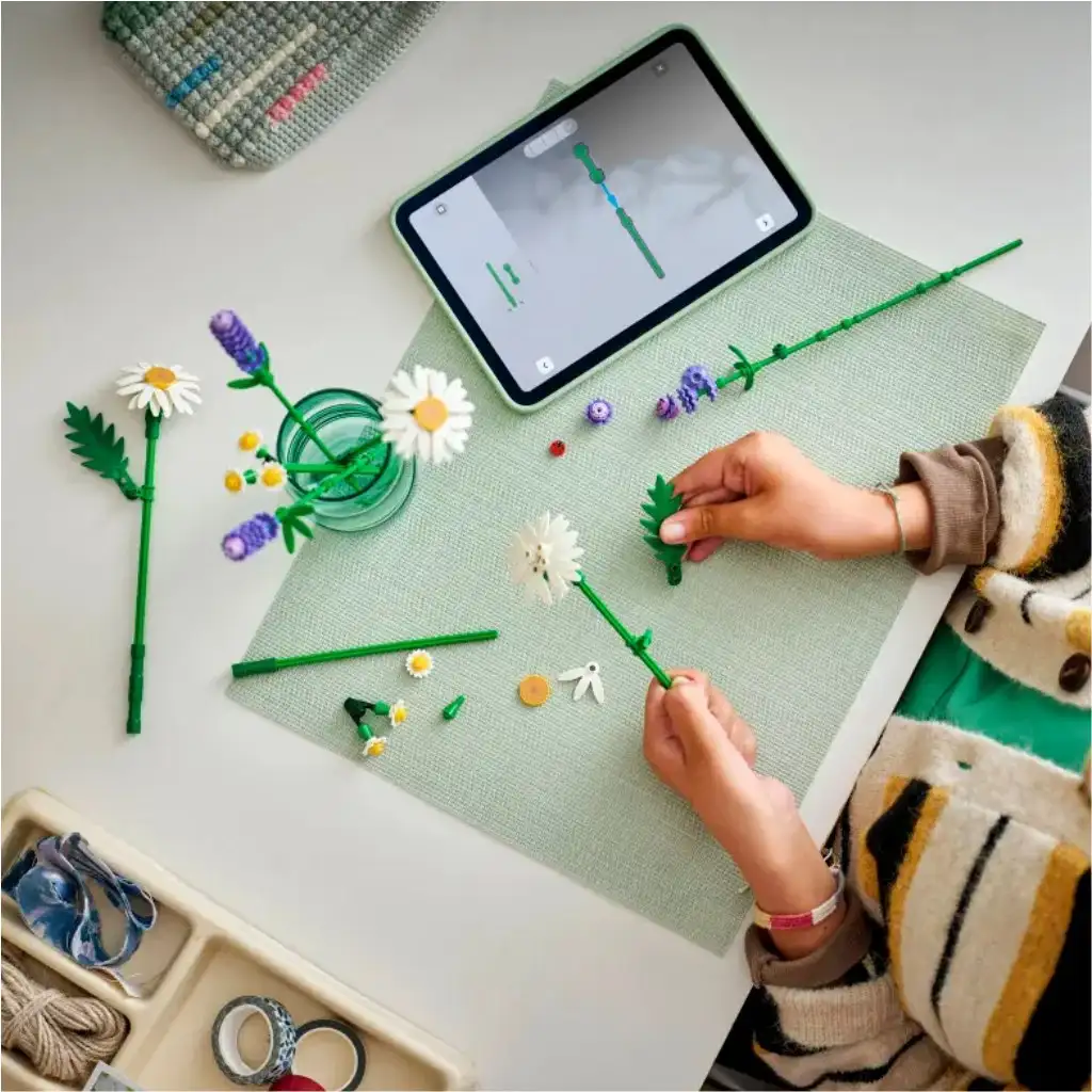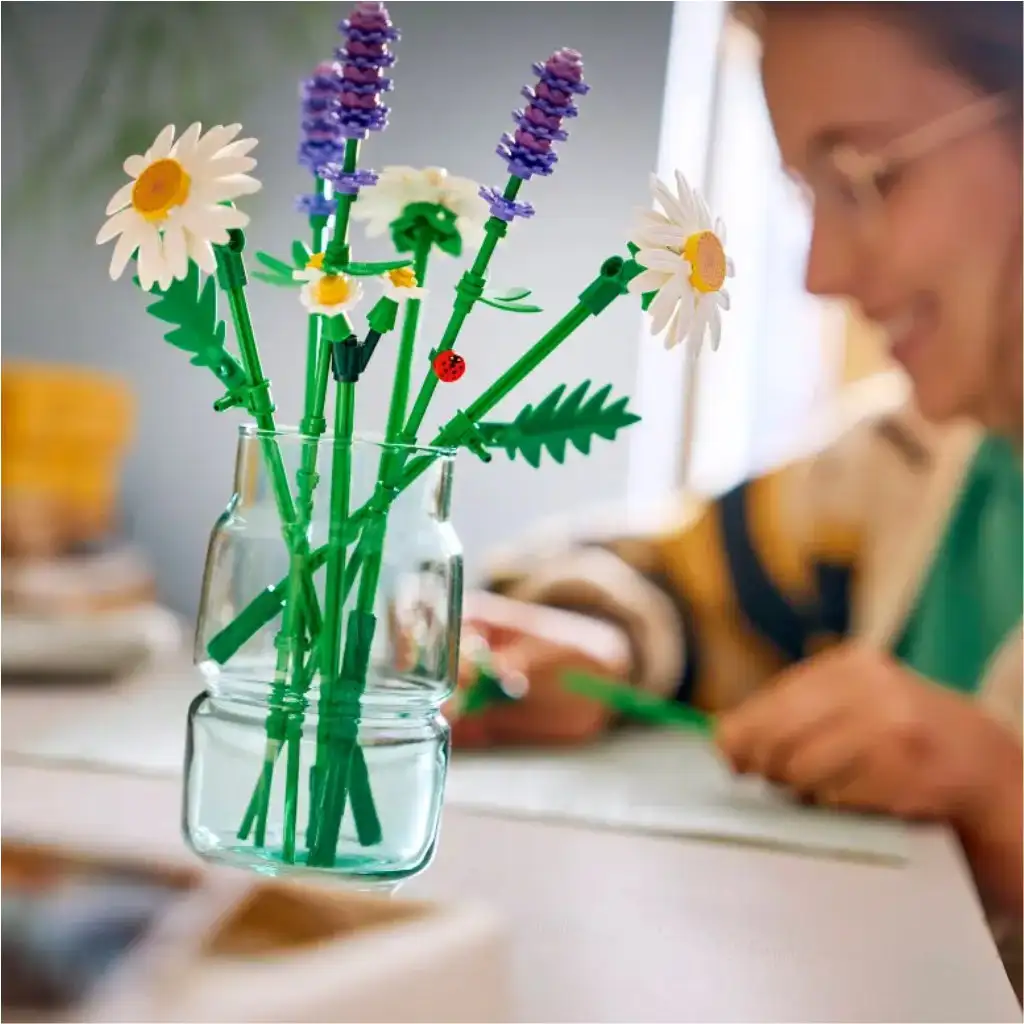 • BOUQUET LEGO® – I piccoli fioristi adoreranno assemblare le 3 grandi margherite, i 2 steli di margherite più piccoli, le 3 rilassanti lavande e i vivaci steli verdi