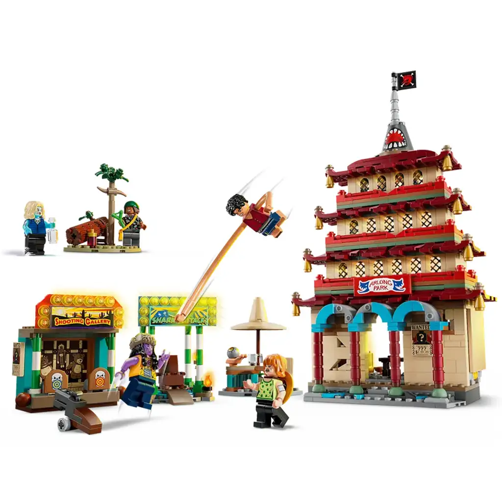 Il set di costruzione include le minifigure di Luffy (con elementi per allungare le braccia), Nami, Usopp, Arlong e Chu. Durante la battaglia, i bambini possono far crollare il modello della pagoda colpendo con forza la cima, o divertirsi a colpire bersagli con i lanciatori di dischi nell’area di tiro. Il malvagio Arlong può essere posizionato sul trono all’interno dell’edificio degli squali. Chu può prendere una bevanda al chiosco, mentre nella foresta si trova la caratteristica bottiglia di ketchup. Il set è dotato di lanciatori di dischi e accessori, come 3 cartelli “Wanted” (ricercato). Per un’esperienza di costruzione digitale, si può ingrandire e ruotare i modelli in 3D e seguire i progressi tramite l’app intuitiva LEGO Builder. Il set comprende 926 pezzi.