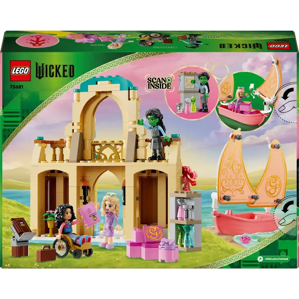 Ledificio dettagliato a 2 piani ha 2 balconi e una sala biblioteca con una libreria. Se i bambini trovano il codice QR e lo scansionano con un dispositivo, possono accedere a contenuti esclusivi LEGO Wicked. Il set di gioco con mini casa delle bambole è pieno di accessori creativi, come fiori, pozioni e un adesivo da attaccare alla sedia a rotelle di Nessarose, permettendo ai bambini appassionati di giochi con case delle bambole di personalizzare il set come desiderano.