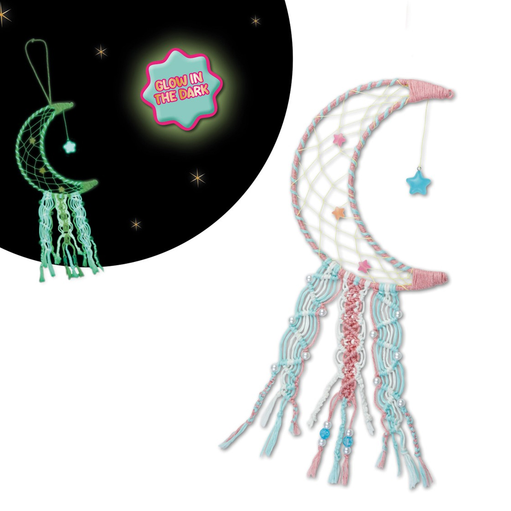 Il kit contiene tutti gli elementi necessari per realizzare un bellissimo acchiappasogni a forma di luna. Con i fili colorati, le perline e gli ornamenti i bambini possono personalizzare la creazione secondo il proprio gusto. Grazie agli elementi luminosi, lacchiappasogni finito brilla anche al buio, creando unatmosfera davvero magica.