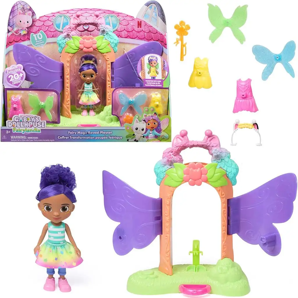 Al centro del set cè la figura di Gabi, che con gli accessori inclusi può essere trasformata in una magica fata. Le ali colorate e intercambiabili, gli abiti e i piccoli accessori offrono oltre 20 diverse possibilità di look, così ogni gioco può creare una nuova storia e un nuovo stile. Il vistoso portale a forma di ali non è solo una scenografia, ma anche il luogo della trasformazione: è qui che iniziano le avventure fatate a Fairylandia.