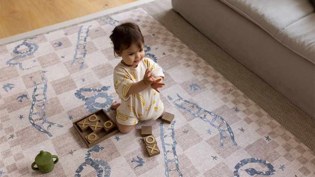 La collezione comprende tre diversi design: il Checker, un motivo a scacchiera nei toni del beige, verde e blu, decorato con adorabili illustrazioni; il Ludo, nelle sfumature dell’oliva e della pesca, ornato da bastoncini sparsi; e infine il Charmer, un tappeto da gioco dai toni caldi e neutri, ispirato al gioco da tavolo Serpenti e Scale. Se non riesci a scegliere tra i tuoi preferiti, non preoccuparti! Ogni tappeto è double-face, così le famiglie possono godere di due splendidi motivi al prezzo di uno.