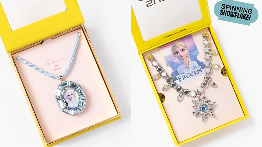 La Collana con Medaglia Super Elsa ha una grande medaglia blu ghiaccio al centro della quale si vede Elsa – un gioiello che ogni fan di Frozen adorerà. Per ancora più brillantezza, la Collana Fiocco di Neve Rotante Elsa incanta con la sua elegante medaglia girevole. Il Set di Anelli Frozen contiene cinque anelli diversi che rappresentano le sorelle sia separatamente che insieme, celebrando così il loro legame speciale. Il Set di Orecchini Frozen offre tre orecchini a clip con i motivi di Anna, Elsa e un brillante fiocco di neve. Per i bambini creativi, il Set di Gioielli Fai-da-te Frozen Elsa offre la possibilità di creare i propri gioielli ispirati a Frozen, così potranno sentirsi ancora più vicini alla loro fiaba preferita.