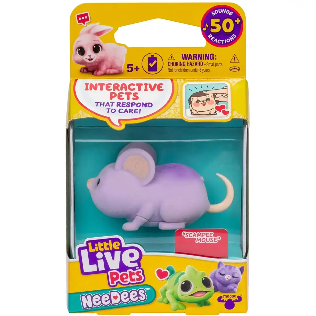 Scampee, il topolino, è uno dei membri più affascinanti della famiglia di piccoli animali collezionabili Needees di Little Live Pets, che conquisterà sicuramente il cuore dei bambini con il suo aspetto adorabile e i suoi suoni divertenti. Questo topolino viola e soffice non è solo carino – risponde con oltre 50 suoni e reazioni diversi quando ci si prende cura di lui. Se lo accarezzi, lo coccoli o semplicemente gli parli, Scampee prende subito vita: cinguetta, fa schioccare i bacetti e può persino ridacchiare – proprio come un vero animaletto!