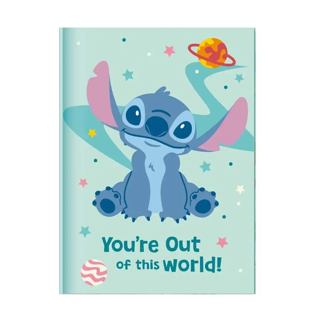 Sulla copertina del diario Stitch sorride su uno sfondo a tema spaziale, mentre la scritta “You’re out of this world!” – ovvero “Sei fuori da questo mondo!” – fa sentire speciale e unico il piccolo proprietario. Linterno, composto da 60 pagine, offre ampio spazio per annotare pensieri quotidiani, inventare storie o disegnare. Il diario si può chiudere con il lucchetto, così ogni pensiero rimane al sicuro – che si tratti di segreti, esperienze con gli amici o sogni ad occhi aperti.