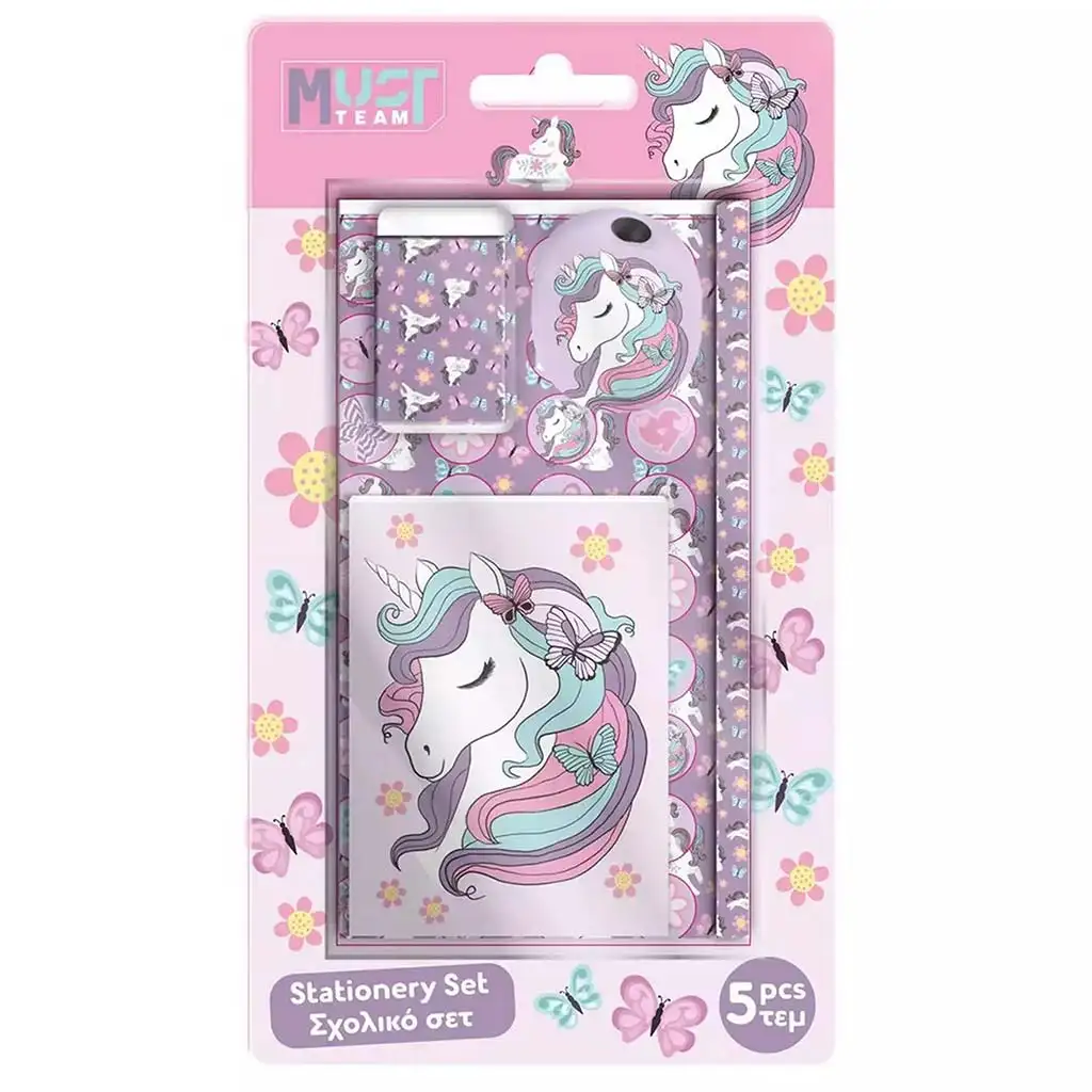 Set di cancelleria magico con unicorno della Must Team che trasporta i bambini nel mondo dei sogni! Questo adorabile set da 5 pezzi è la scelta ideale per ogni piccolo scolaro che ama le creature fiabesche e le fantasie dai colori vivaci e sognanti. Il set presenta una splendida grafica di unicorno, decorata con farfalle e fiori, offrendo così un’atmosfera veramente femminile e fiabesca.